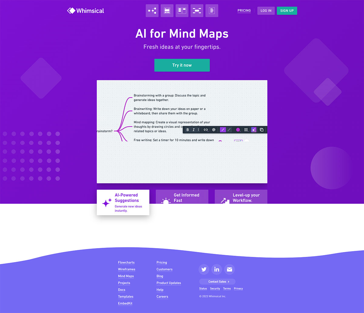 Whimsical 是一个用于思考和协作的可视化工作空间,结合了流程图、思维导图、线框图、便笺、文档等多种类型,你可以在一个工作区内创作所有支持的绘图类型,并且可以使用文件夹来组织管理文档。