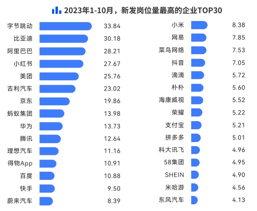 2023年1-10月,新经济行业新发岗位量前三十的企业中,泛互联网业企业21家,依然是吸纳人才最多的赛道。此外,还有比亚迪、吉利、理想、蔚来、东风汽车5家新能源汽车企业。